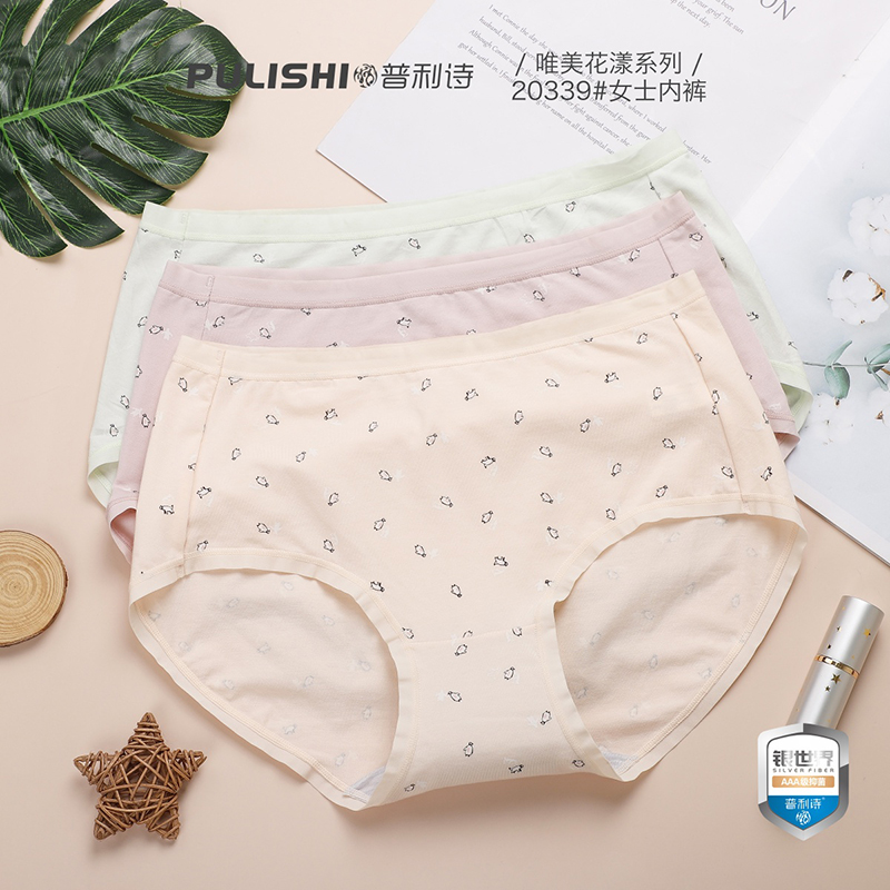 【产品名称:一盒2条 普利诗内裤女士莫尔代棉印花中腰三角短裤抗菌底裆20339】