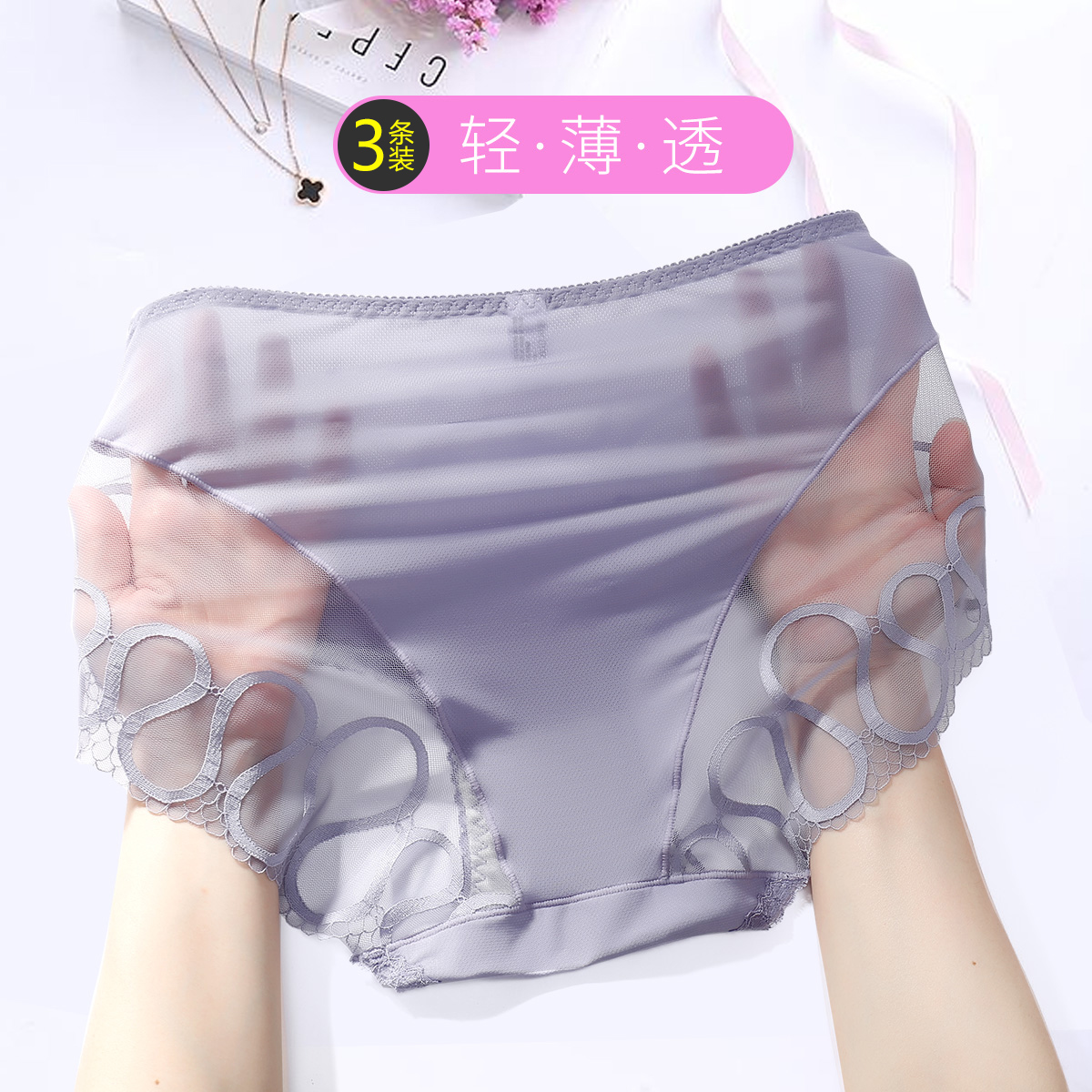 【产品名称:古今@3条装【100%纯棉底裆】女士轻薄纱性感蕾丝内裤透气抗菌春夏】