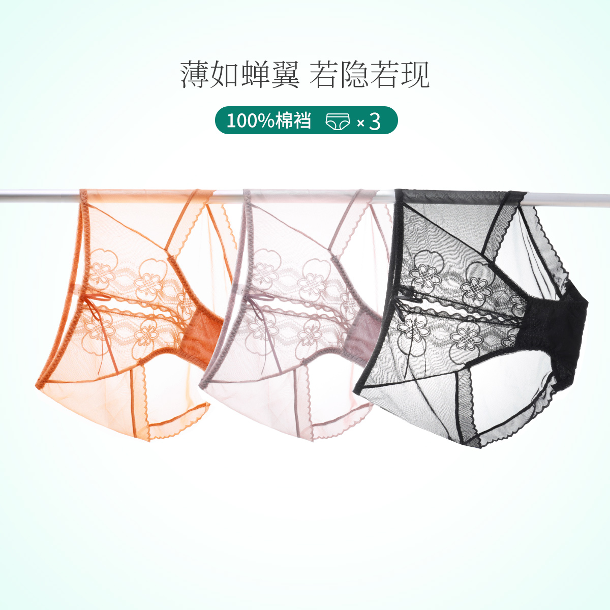 【产品名称:古今@3条装 【100%纯棉底档】性感透视蕾丝网纱氧气中腰女士内裤】