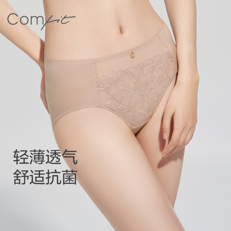 【产品名称:Comfit抗菌中腰内裤女薄款冰丝透气大码三角裤头蕾丝拼接C200156】