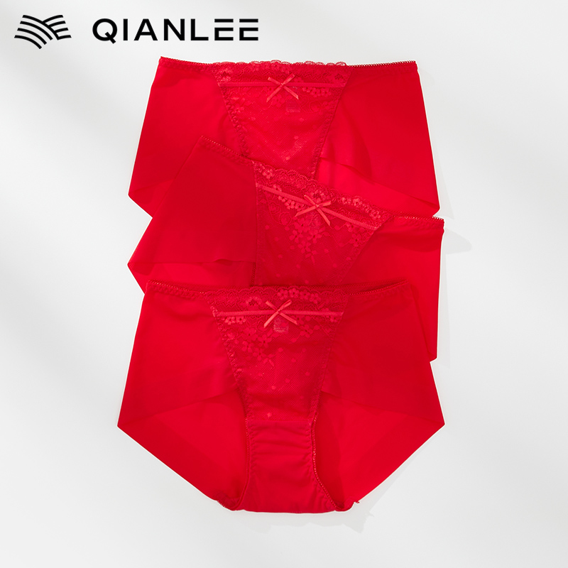 【产品名称:本命年红色冰丝内裤女纯棉裆中高腰无痕蕾丝花边性感三角女士短裤】