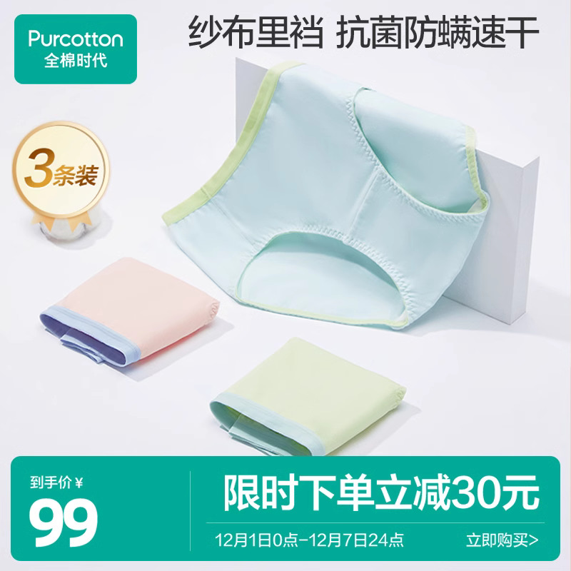 【产品名称:全棉时代女士抗菌纱布内裤中腰收腹薄款透气女生三角短裤头3条装】