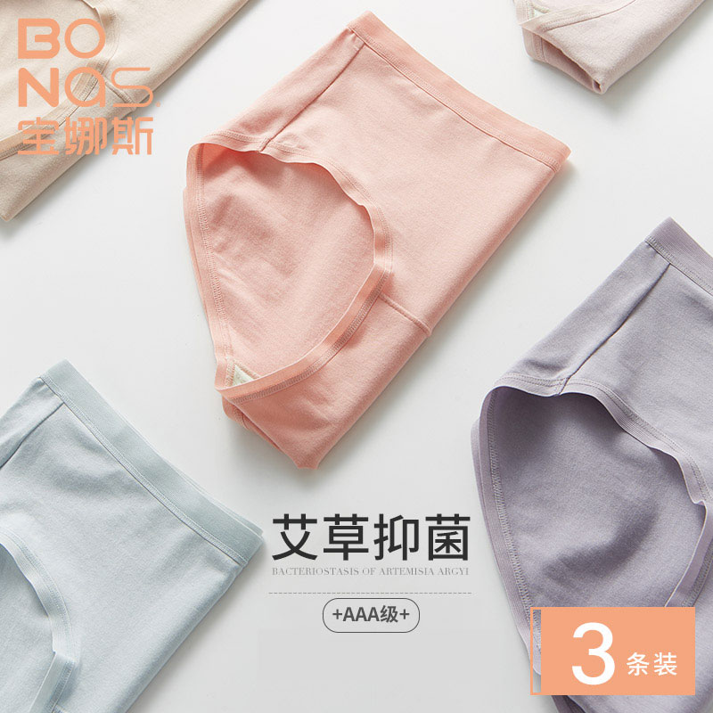 【产品名称:3条宝娜斯莫代尔艾草纤维抗菌底裆内裤女春秋款透气中腰三角裤】