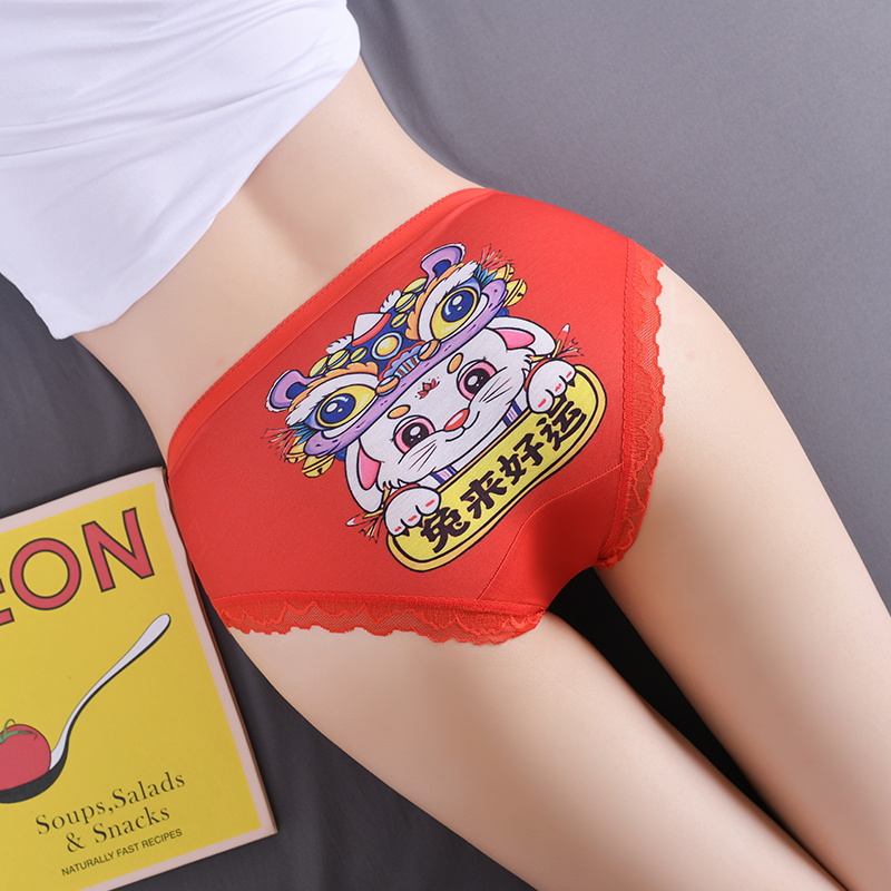 【产品名称:洁韵朵本命年属兔纯棉内裤红色女中腰蕾丝边女生结婚礼物兔年短裤】