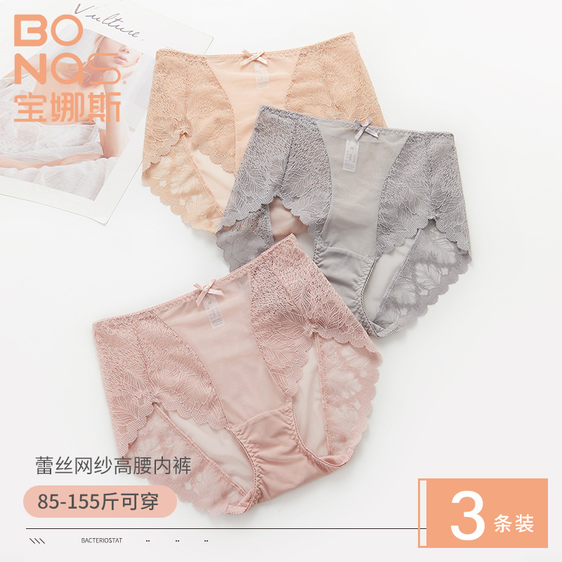 【产品名称:宝娜斯内裤女性感时尚蕾丝高腰女士三角裤无痕透气纯棉裆大码内裤】