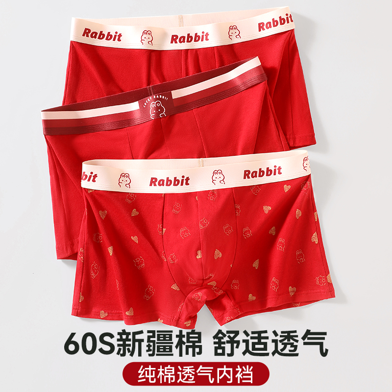 【产品名称:本命年男士内裤男生纯棉四角裤头大红色属兔年平角短裤衩结婚礼物】