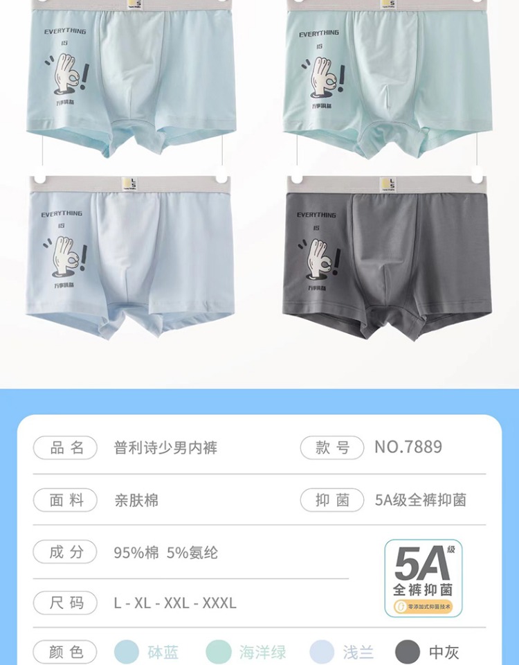 【产品名称:普利诗3条装新款青少年内裤中大男童亲肤棉抗菌无缝平角裤7889】