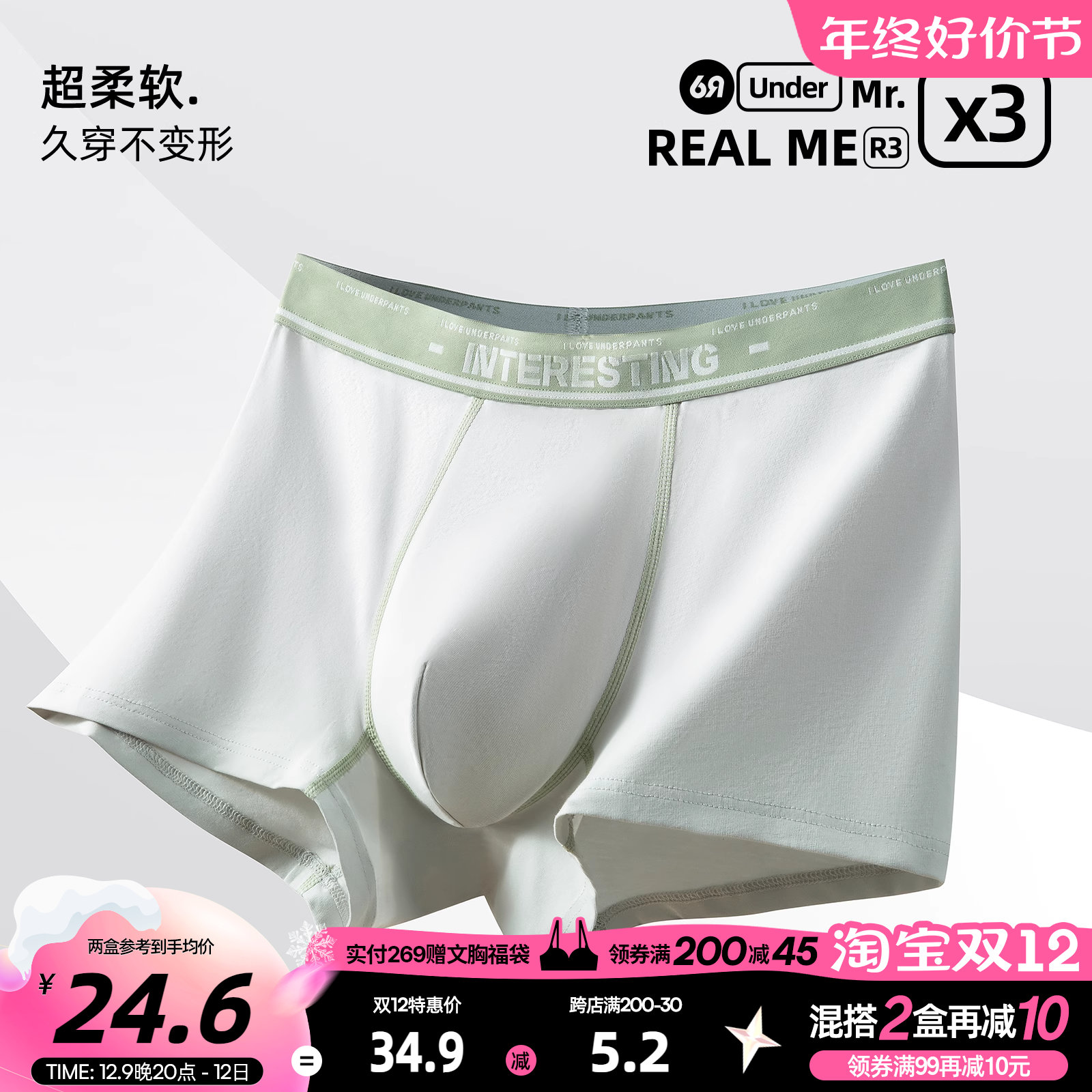 【产品名称:六只兔子内裤男棉质透气5A抗菌底裆男生3条装亲肤高弹中腰平角裤】