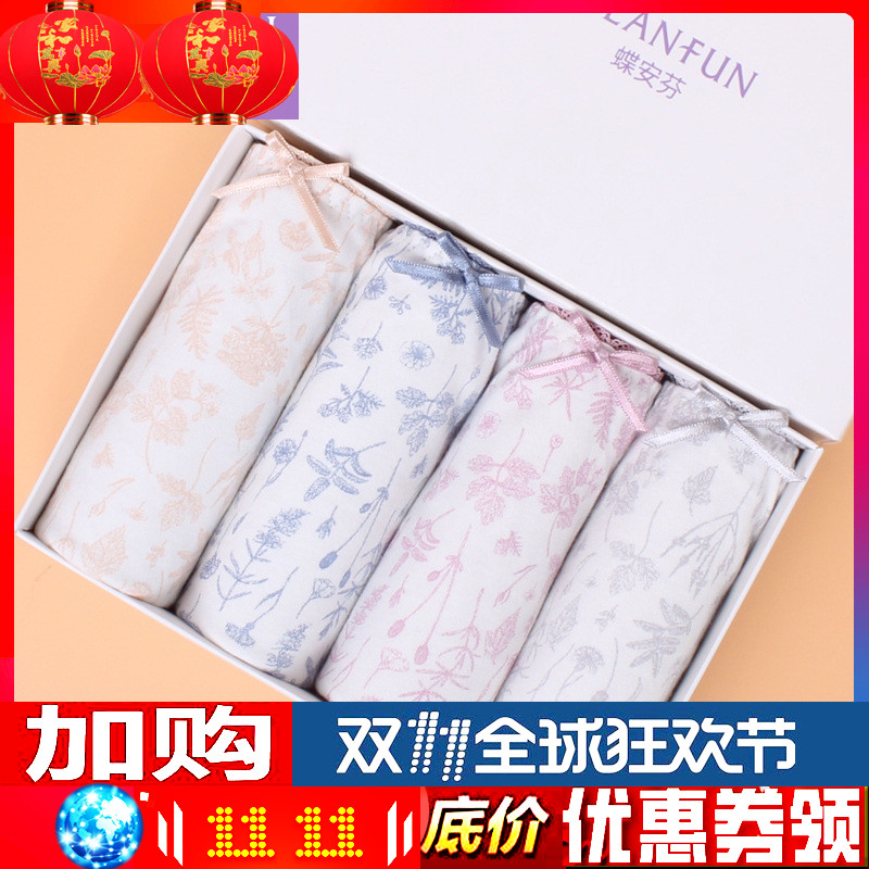 【产品名称:四条装蝶安芬女士纯棉内裤礼盒高腰印花100%全棉大码防过敏底裤】