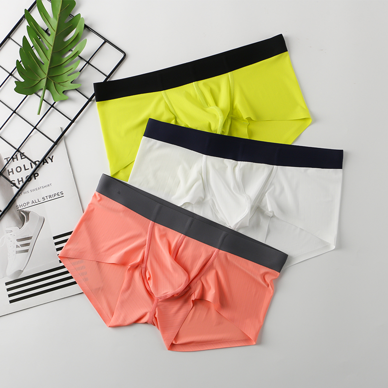 【产品名称:男士冰丝无痕紧身内裤透气条纹纯色大囊袋凹凸青年性感弹力平角裤】
