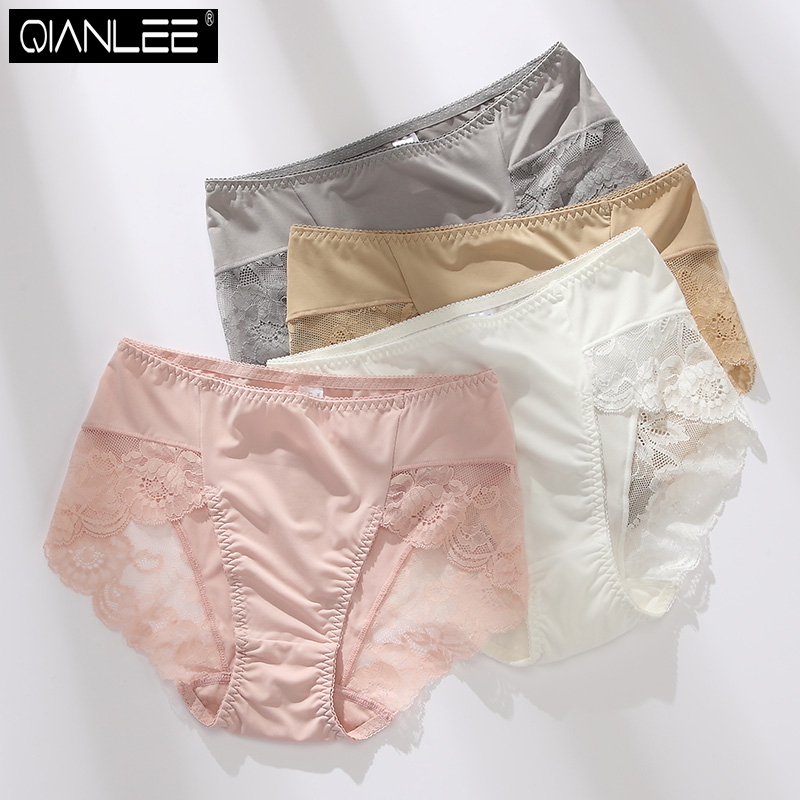 【产品名称:丝滑牛奶丝性感蕾丝内裤女士冰丝无痕中腰纯棉档三角裤大码夏薄款】