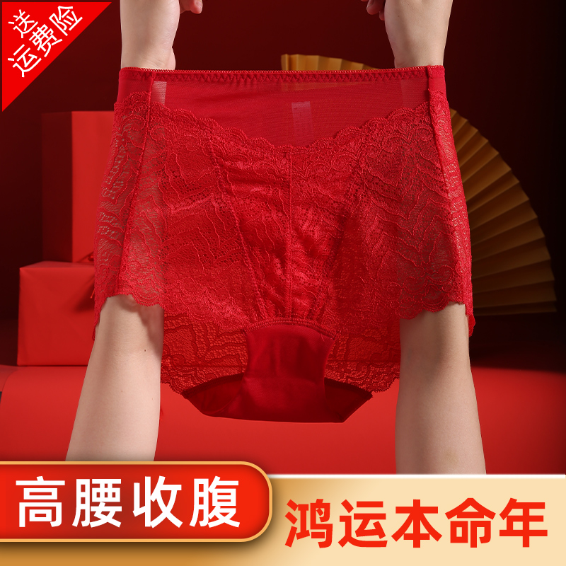 【产品名称:大红色内裤女夏季薄款大码胖mm本命年200斤女士性感高腰收腹蕾丝】