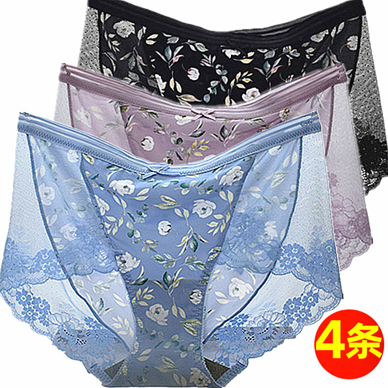 【产品名称:3条装彩田内裤女士大码冰丝网纱蕾丝边高腰31653透明性感速干印花】