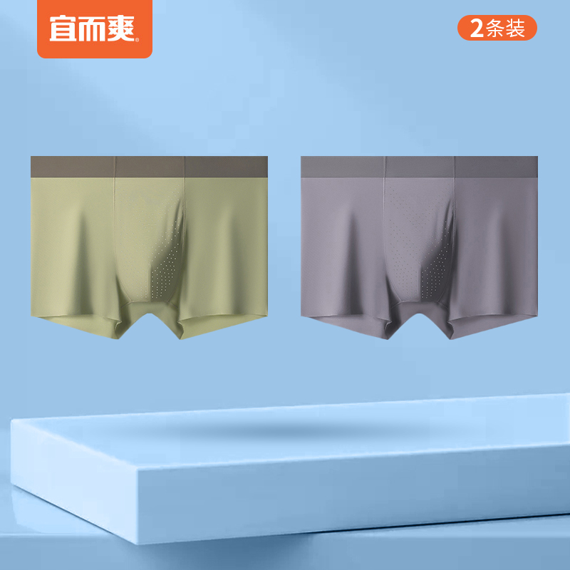【产品名称:宜而爽男士无痕冰丝内裤网眼透气平角裤抗菌锦纶平口男裤衩 2条装】