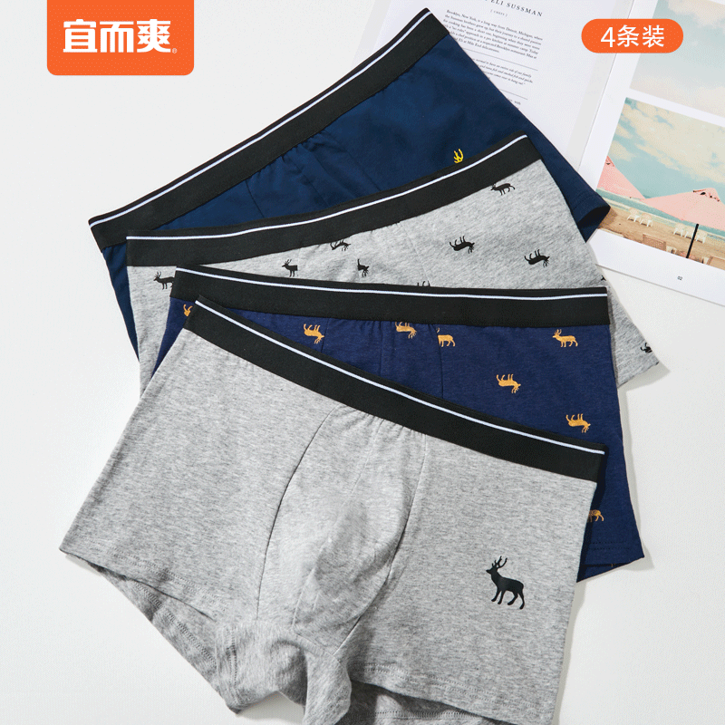 【产品名称:宜而爽内裤男士纯棉高弹印花明筋四角裤5A级抗菌夏季大码男平角裤】