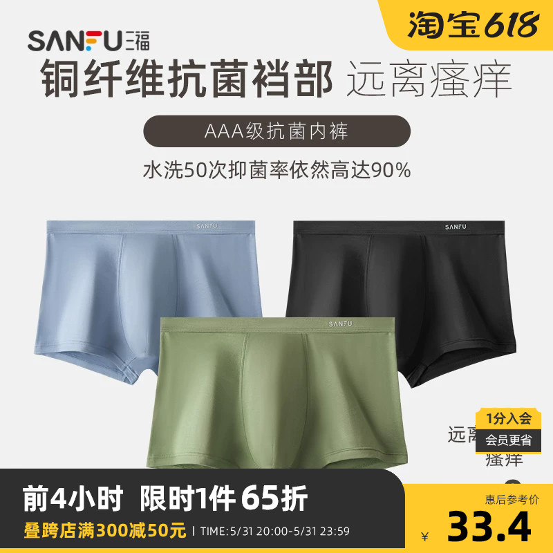 【产品名称:三福男平角弹力3条装内裤抑菌健康纯色基础款弹力舒适内裤431413Z】