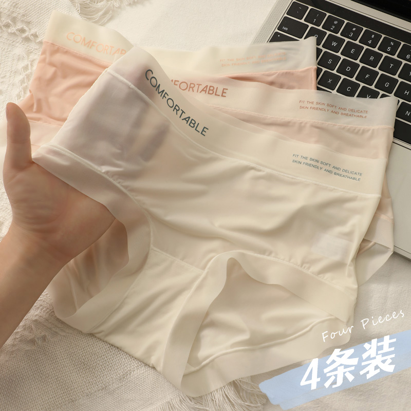 【产品名称:4条 无痕内裤女士冰丝夏季薄款纯棉抗菌裆中腰收腹平角凉感短裤头】